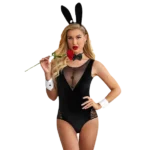 Llega a Tus Deseos Son Ordenes el sensual y elegante disfraz de conejita que tanto esperabas, es un increíble body malla negro con transparencia en escote y encaje en los costados, además de una coqueta cola de conejo de felpa en la parte trasera ideal para seducir y jugar con tu pareja.